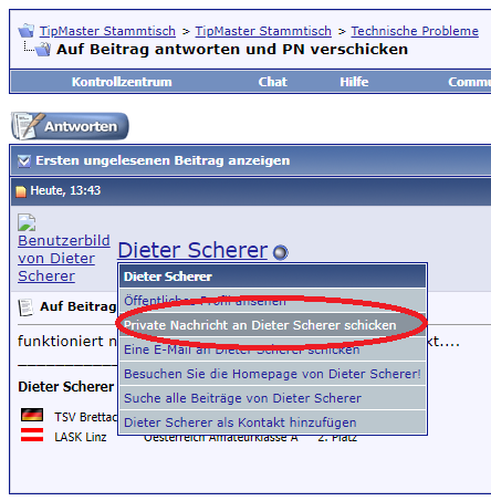 PN funktioniert auch, wenn Du auf de Benutzernamen klickst und dann "Private Nachricht an [Benutzername] schicken" klickst.